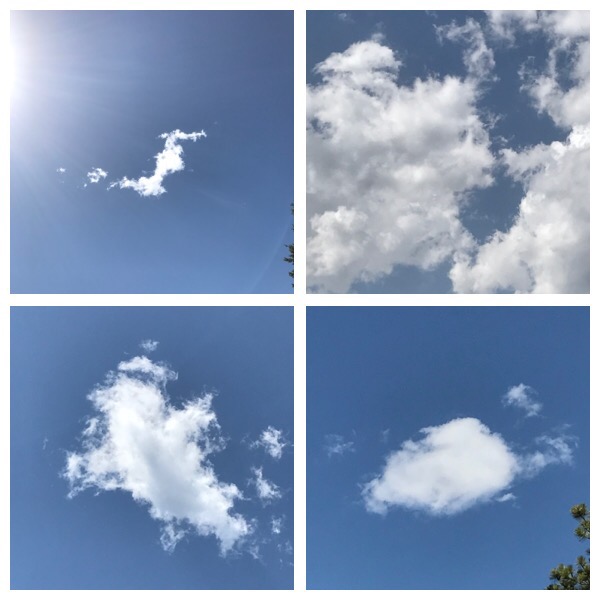 Someone close to me once said I am easily entertained. I’m not sure if it was a compliment but I took it as one. I’m truly never bored and am always looking for beauty or inspiration wherever I go. My imagination is strong; probably the reason I enjoy being with children and writing fiction. Last week I posted these 4 pictures of clouds on Facebook asking friends to weigh in on what they saw. I was not disappointed by the quantity or quality of responses. Most friends agreed that the top left was a seahorse and bottom left was some type of bird – penguin, chick, rooster, hummingbird, etc. The other 2 had a wider variety of ideas including many people thinking the top right was their dog or a mother kissing a child. The sweetness of ideas made me happy that so many others who didn’t see these clouds in person were able to enjoy the game of imagining what they were. Thanks to all who stopped to use their imaginations and share their ideas.
