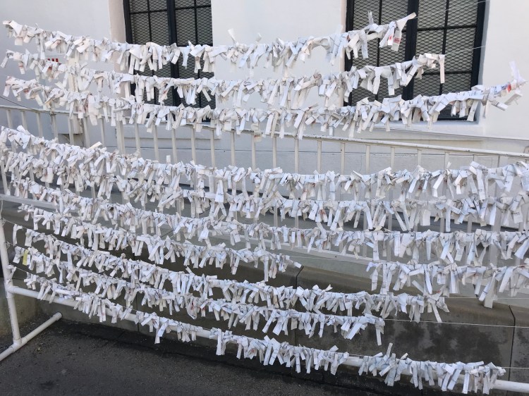 Outside of the Buddhist temple we saw strings with paper tied to them. Omikuji are strips of paper with fortunes that can be purchased at Shinto shrines and Buddhist temples all over Japan. If you receive a good fortune, you take it home. If you receive bad fortune, you tie it to a tree or stand designated for this, and leave your bad luck behind.