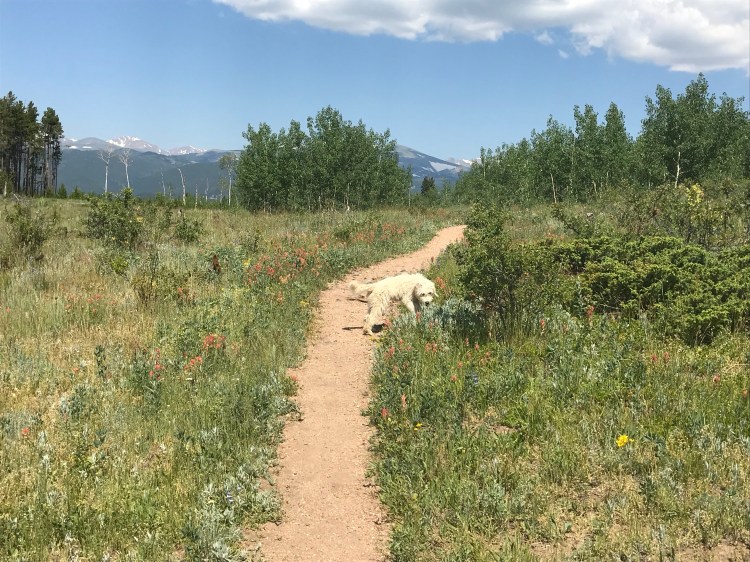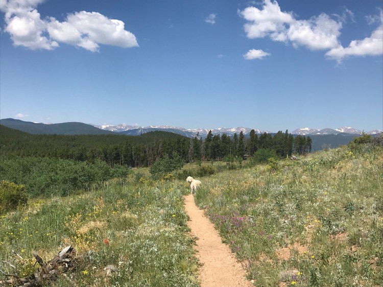 Views of the Continental Divide in the distance, vibrant wildflowers on either side of the trail, and Charlie enjoying the freedom to run and expend his endless energy. A great way to spend the morning.