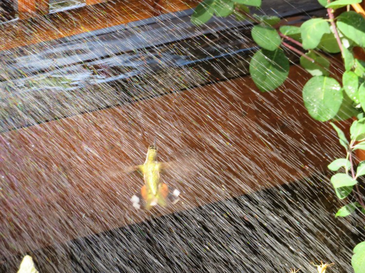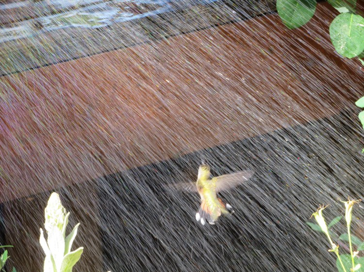 The glorious feeling of cool water brought this hummingbird to the garden on Friday afternoon.