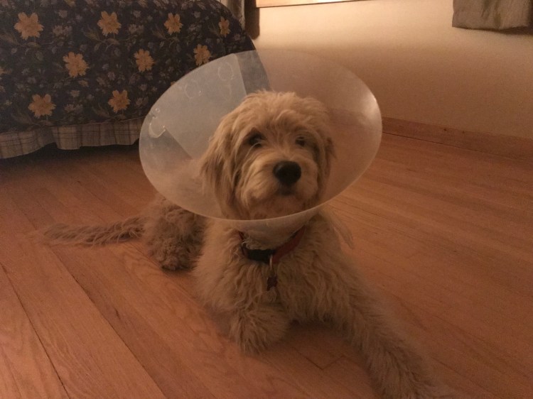 He looks adorable in the cone and really only needs it if he’s being left alone or at night. Charlie is doing well, but doesn’t understand that running around the house and leaping down the stairs are not what to doctor ordered.