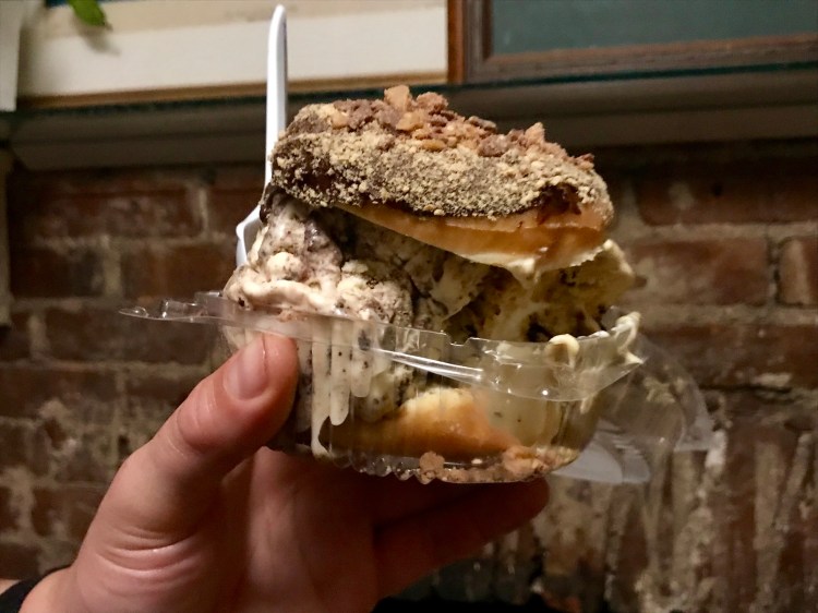 This year, I was with my nephew and we happened to notice a shop that sold ice cream filled donuts! When the children were little, he had convinced them even if they were full, there was a separate “dessert pocket” in their stomachs so they could always join him for dessert. His favorite dessert was profiteroles and this was basically a giant version of one.