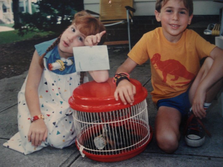 Here I am with my brother and a little bird named “Mikey” that we saved from our cats. It was too little to fly, so we brought it to The Audubon Society until it was able to fly on it’s own. The paper I’m holding says “Mikey the Bird”.