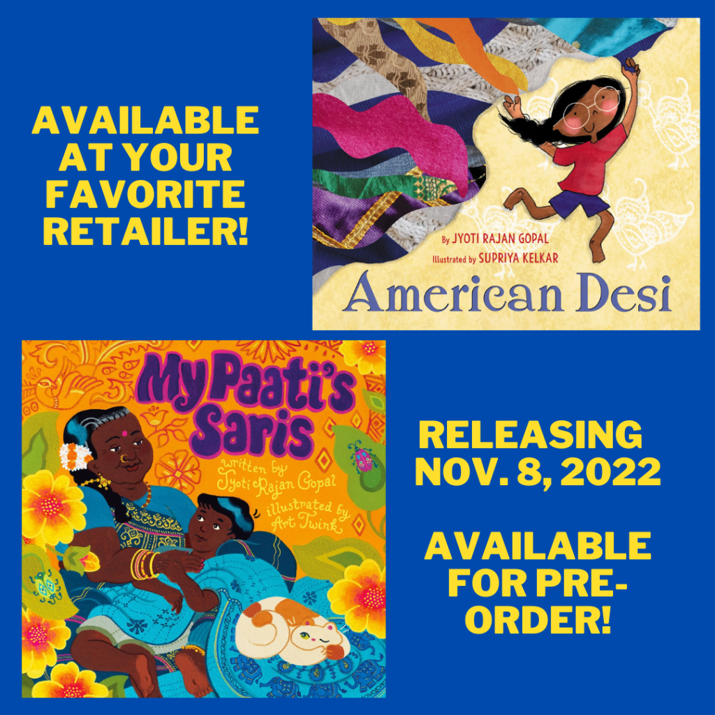 I’m happy to share my interview with Jyoti Rajan Gopal and celebrate the first of her two picture books being released in 2022! You can buy AMERICAN DESI, illustrated by Supriya Kelkar now and preorder MY PAATI’S SARIS, illustrated by Art Twink. She recently had a fabulous book launch in New York where her friend shared musical talents while Jyoti shared her book.