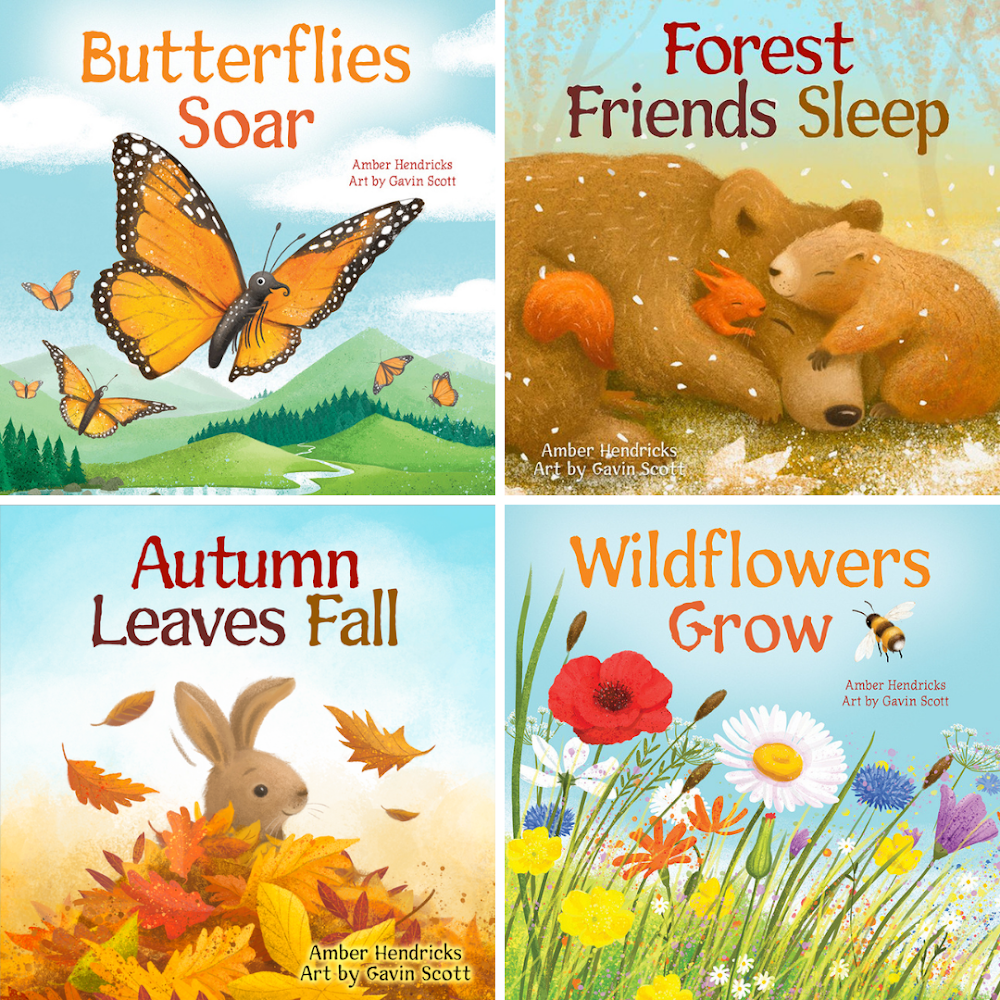 AUTUMN LEAVES FALL and FOREST FRIENDS SLEEP, my upcoming board books with illustrator Gavin Scott, round out our Little Nature Explorers series with Amicus Ink. Just like the series title suggests, these books focus on magical transitions found in nature, from the changing of leaves to preparing for hibernation.