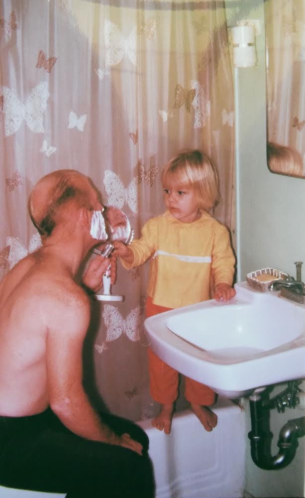 I, on the other hand, was very quiet, very shy, and very serious, as you can see in this pic of me “shaving” my dad. I clearly took the task to heart. And I have a distinct memory of my fourth-grade teacher asking me, “Don’t you ever smile?”
