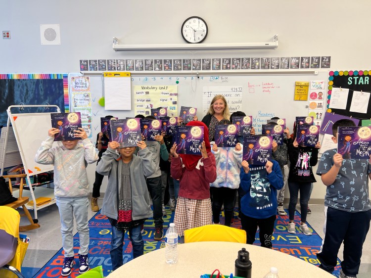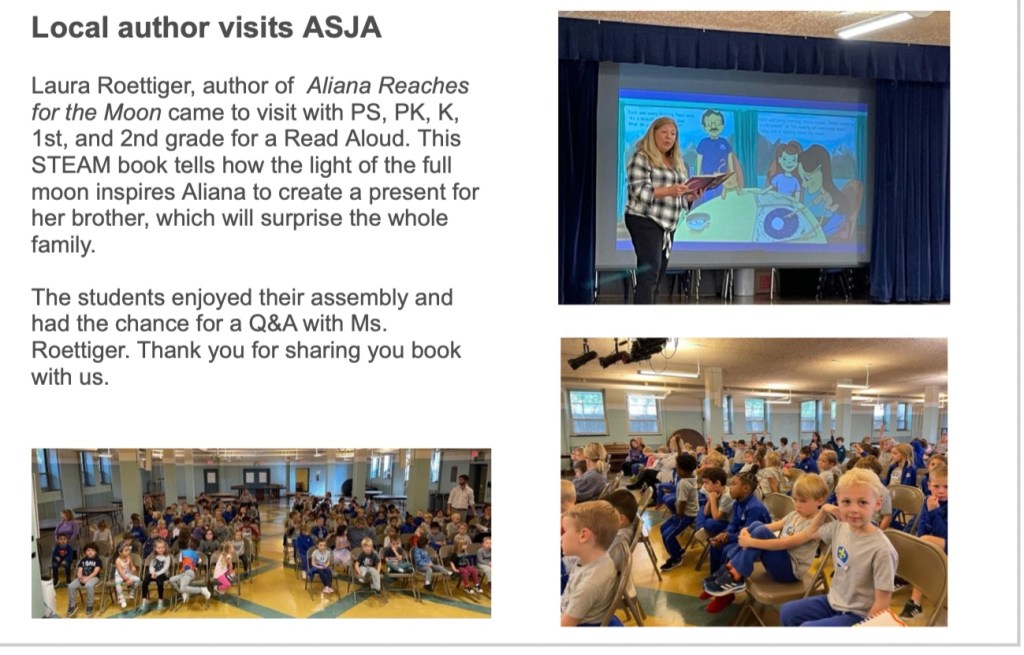 “My 2nd graders love science and they love asking questions so this was the perfect author’s visit! After a read aloud of Aliana Reaches for the Moon they had the chance to ask Ms. Roettiger more questions about becoming an author and about the phases of the moon & the night sky. Two of my students even dressed up as Aliana for our school’s Parade of Books!”