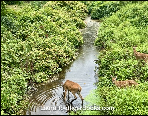 Mama leads her fawn to drink, midbreakfast buffet then more munching